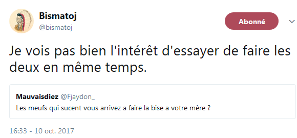 – Avec un copain une fois, mais quel rapport ? pic.twitter.com/H0FfWscKjw— Guillaume Bauret (@GuillaumeBauret) October 18, 2017