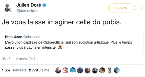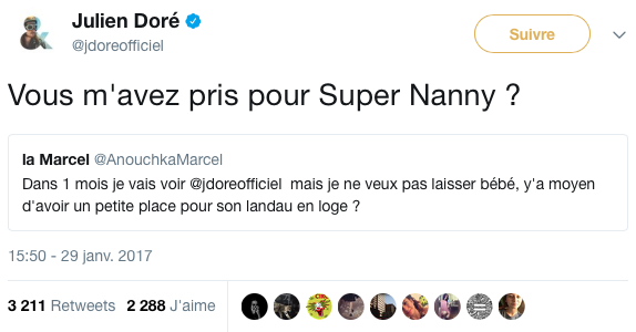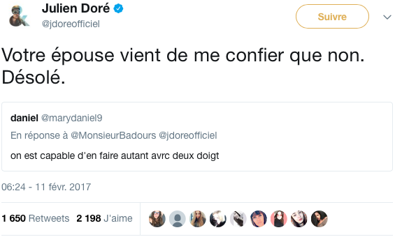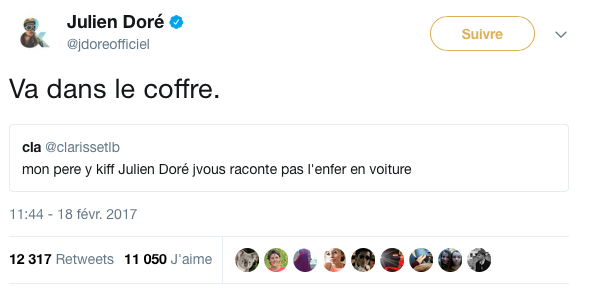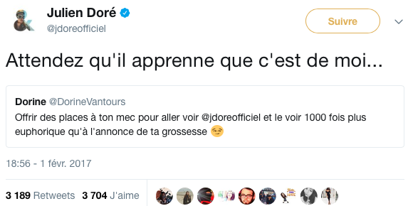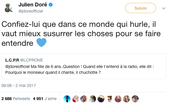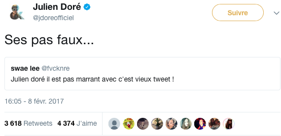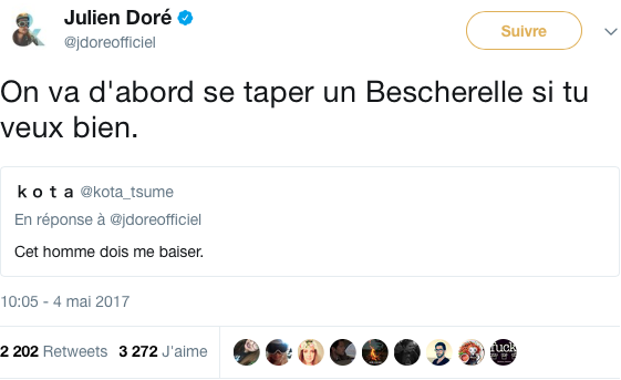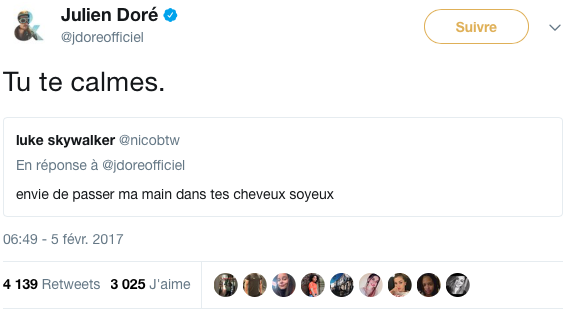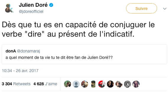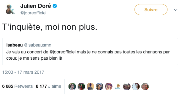 Julien Doré n’est pas qu’un sublime chanteur à barrette. Non, non. Sur Twitter @jdoreofficiel s’applique à répondre à ceux qui le cherchent et ce, toujours avec humour et délicatesse (ou pas). Sélection de 15 de ses meilleures punchlines :