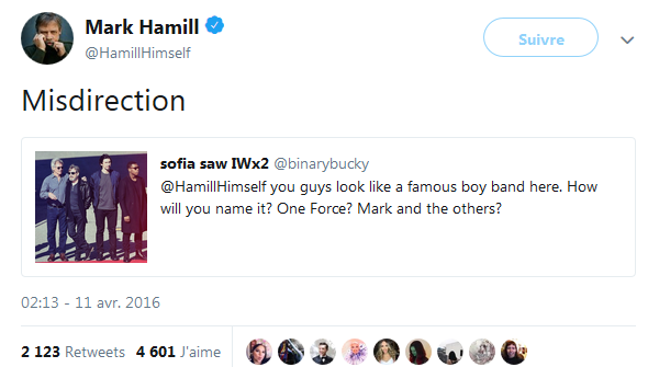 Tweet : On dirait tellement un célèbre boys band là dessus. Comment vous l’appelleriez ? Une Force ? Mark et les autres ?