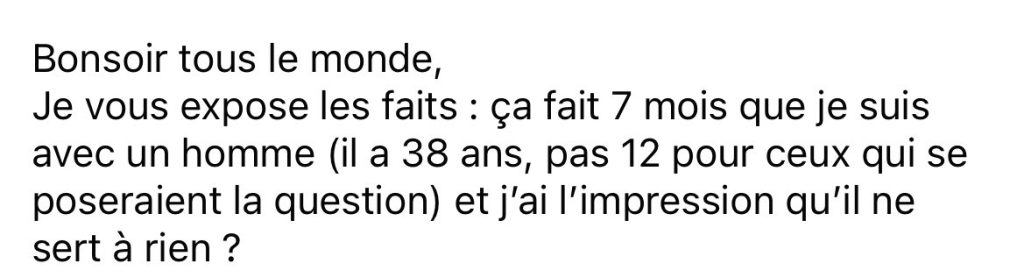 Au fait, les hommes hetero là. Vous voyez ce que fait Macron avec la France ? Ne pas écouter, n’en faire qu’à sa tête, n’assumer aucune responsabilité, accuser la gauche, le gaslight, l’humiliation. C’est désagréable hein ? Bah c’est ce qu’on vit quand on est en couple avec vous.