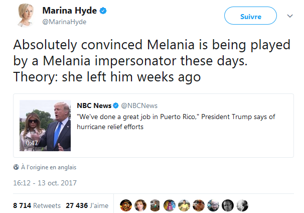 Absolument convaincue que Melania est jouée par une imitatrice. Théorie : elle l’a quitté il y a quelques semaines.